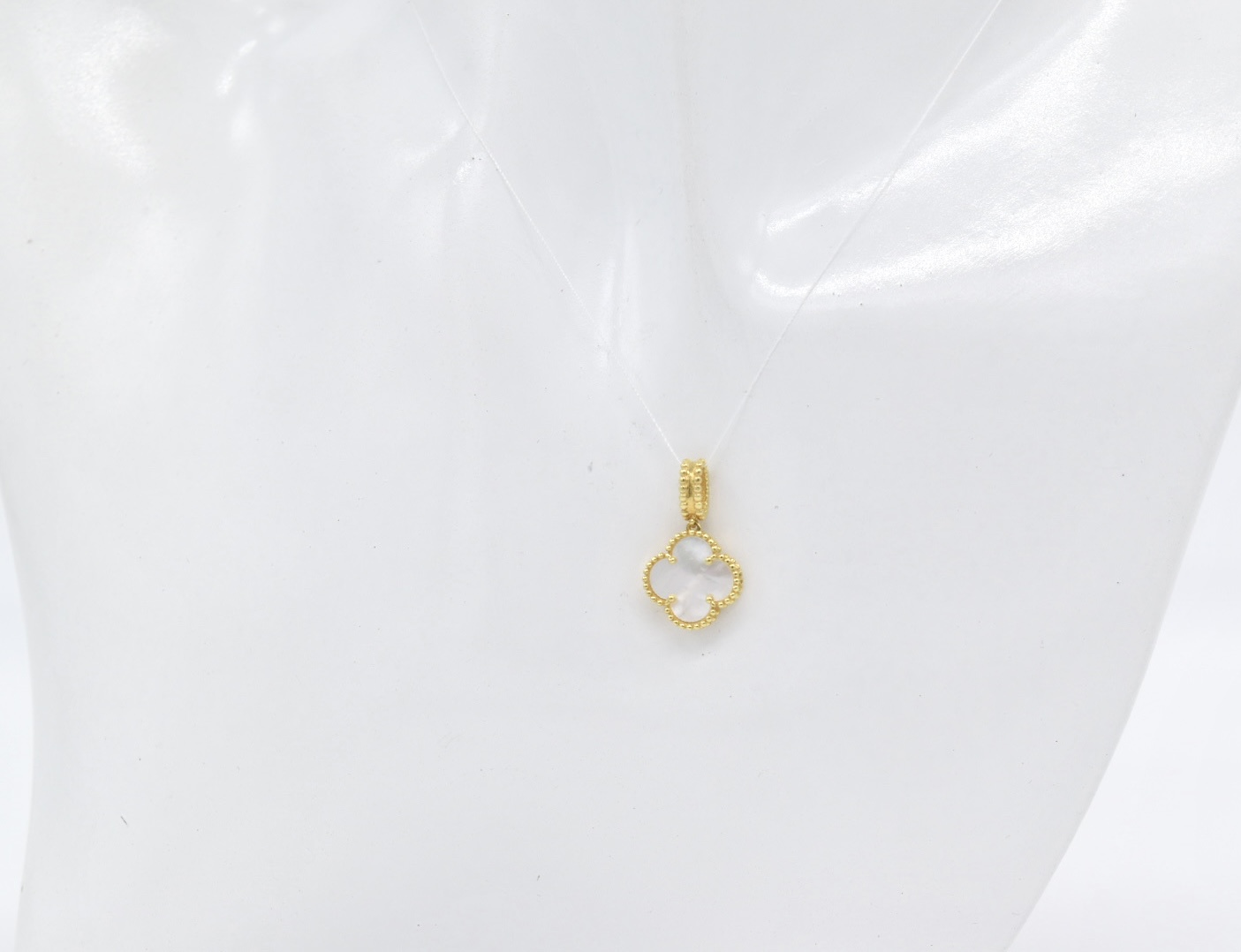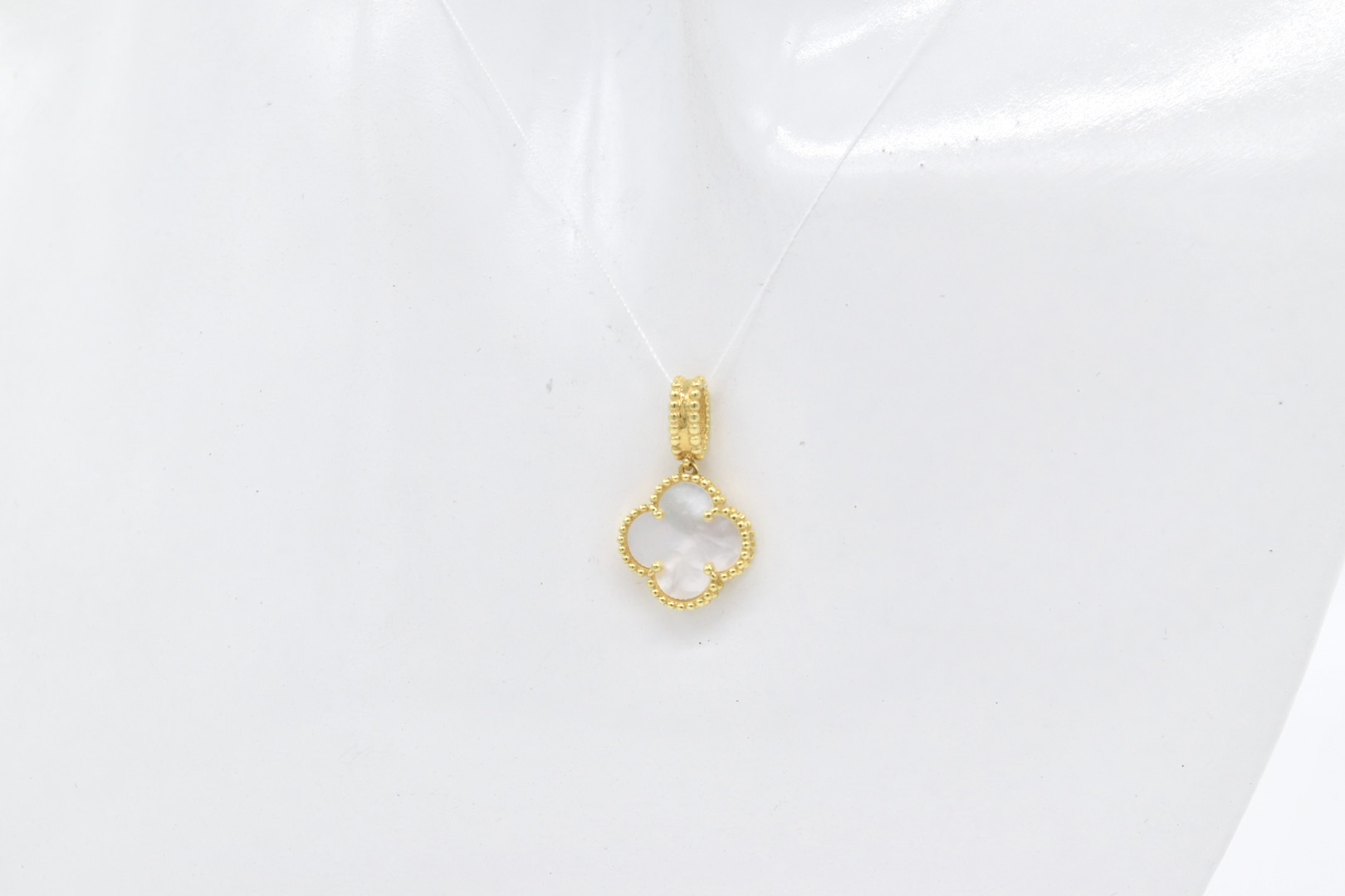 Pretty 18K yellow gold clover pendant (1.44 g) with a 12 mm white mother-of-pearl center. Petite, luminous, and perfect for a delicate chain or layered look.