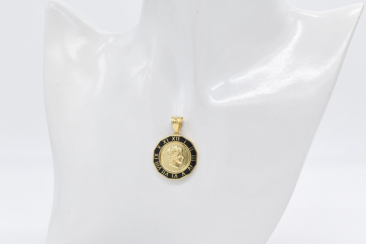 Bold 18K yellow gold pendant with a black finish, Roman numerals I–XII, and back-to-back motifs: