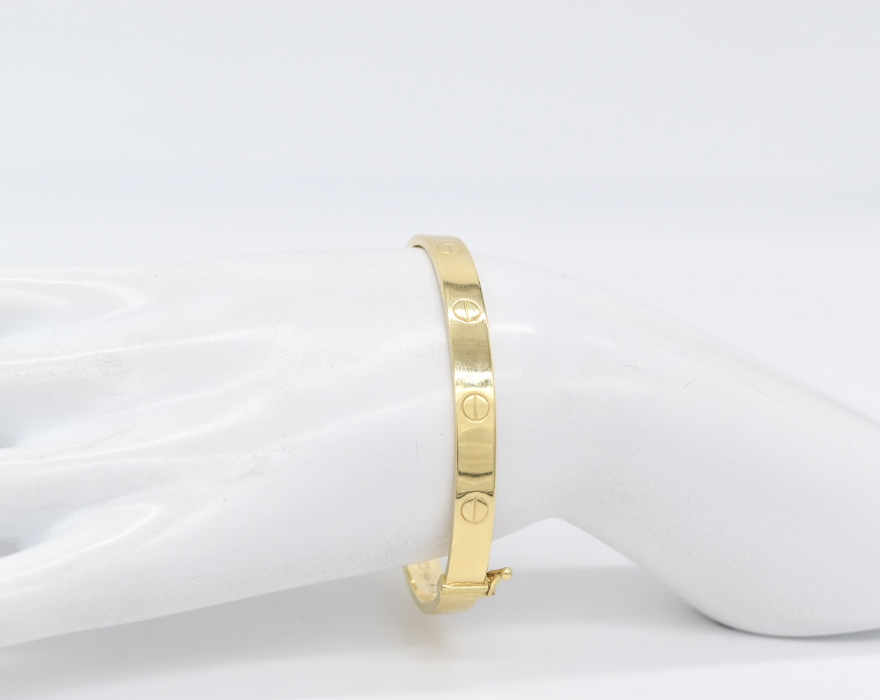 Chic 18K yellow gold clip-love bangle (7.04 g) with a sleek, modern clasp detail. Size 17 cm — stylish, comfortable, and ideal for everyday wear or stacking.