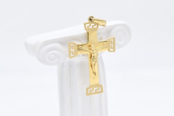 Ornate 18K yellow gold cross pendant (3.80 g) featuring Jesus on the front, a plain back, and patterned edges in a Greek-inspired motif. Size 35 x 24 mm — detailed, reverent, and striking on any chain.
