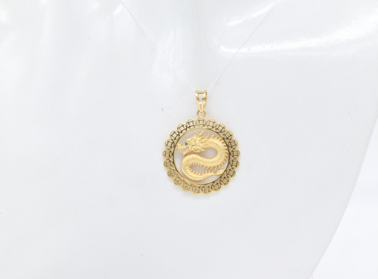 Striking 18K yellow gold pendant (3.66 g) featuring a money-catcher dragon motif with a green eye and a grooved back. 25 mm — bold, symbolic, and perfect for a statement chain.