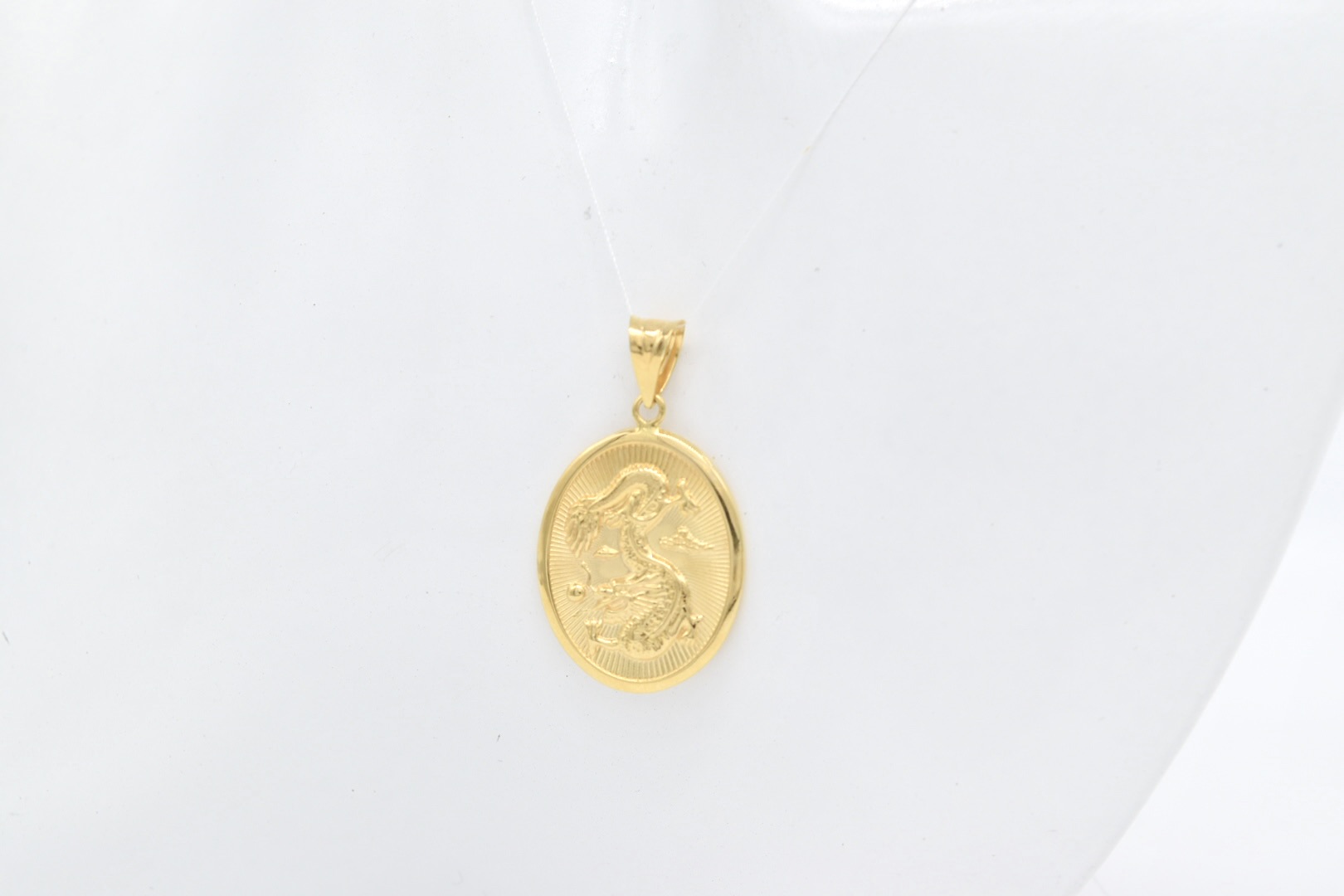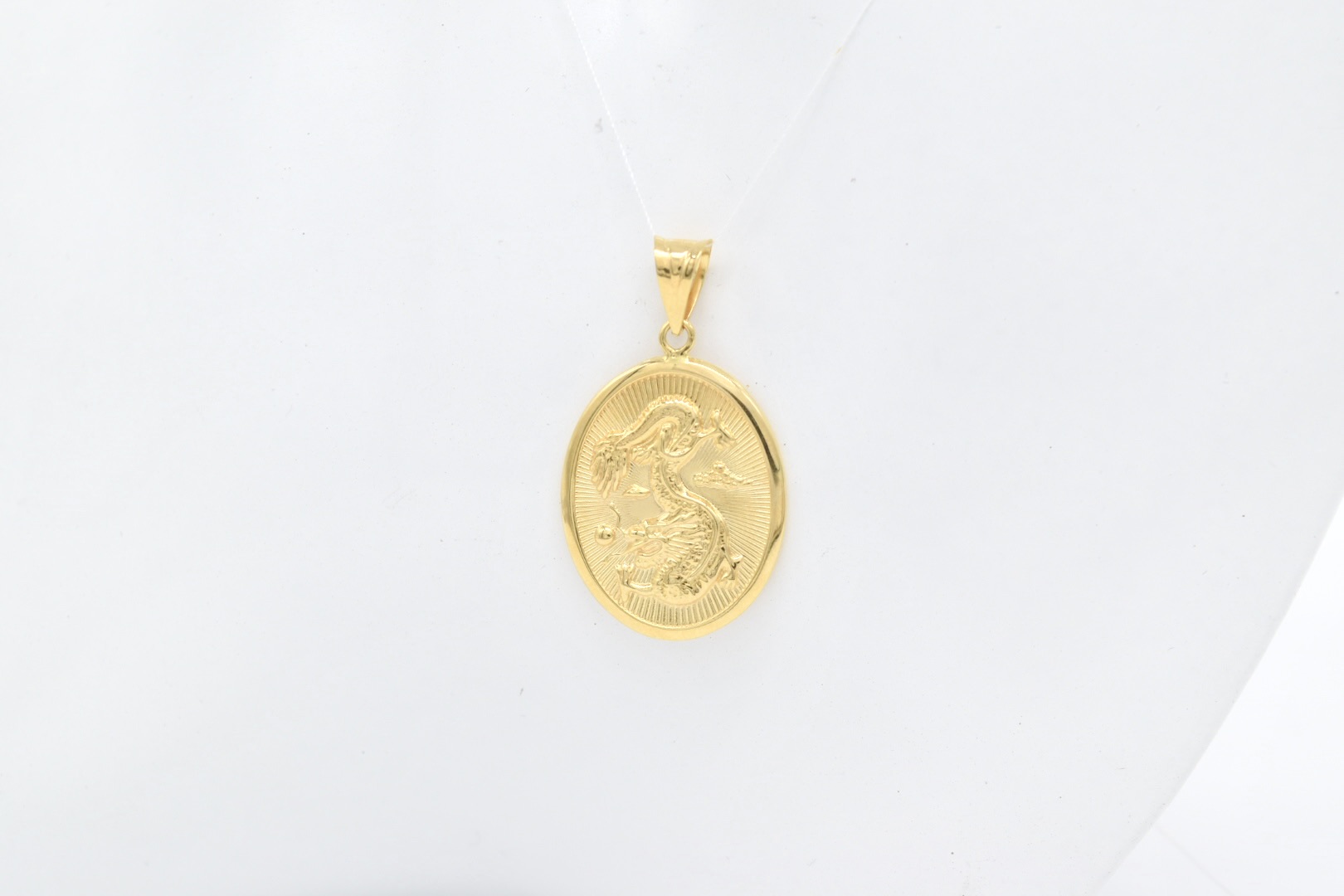 Striking 18K yellow gold oval pendant (3 g) with back‑to‑back designs: a detailed dragon on one side and a Chinese character symbol on the other. Compact, symbolic, and perfect for a statement or cultural piece.