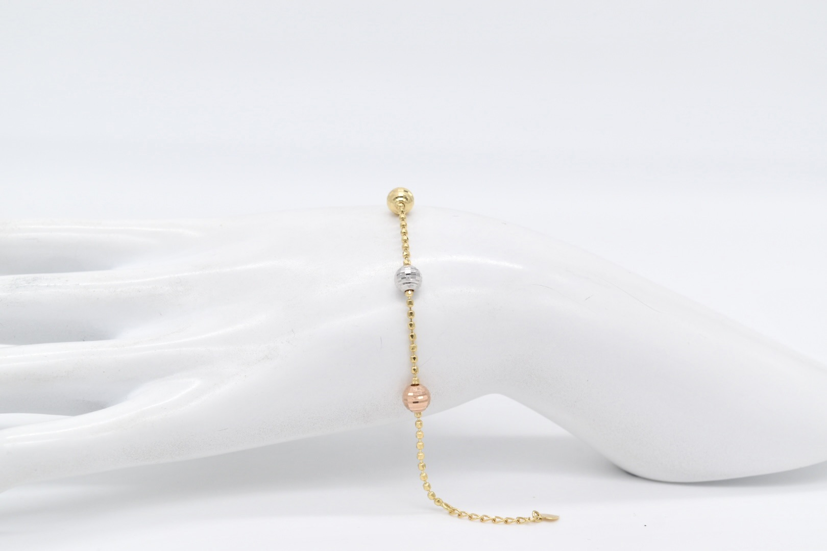 Elegant 18K yellow, rose, and white gold bracelet (3.62 g) with 6 mm stationed beads. Adjustable lock from 6.5 to 7.5 inches for a perfect fit—timeless, versatile, and great for stacking.