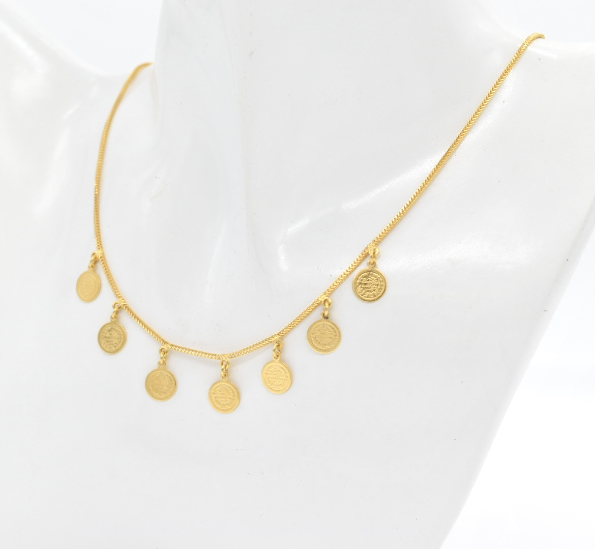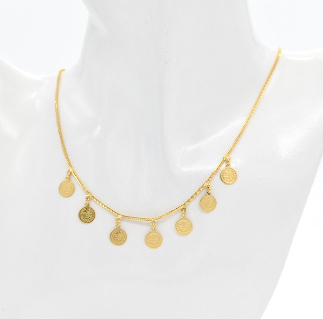 A graceful 7-stationed coin necklace in warm 21K yellow gold. Seven small 8 mm coins are spaced along a delicate chain to create a balanced, elegant look that layers beautifully or shines on its own. Lightweight and refined, it’s perfect for daily wear or as a thoughtful gift.