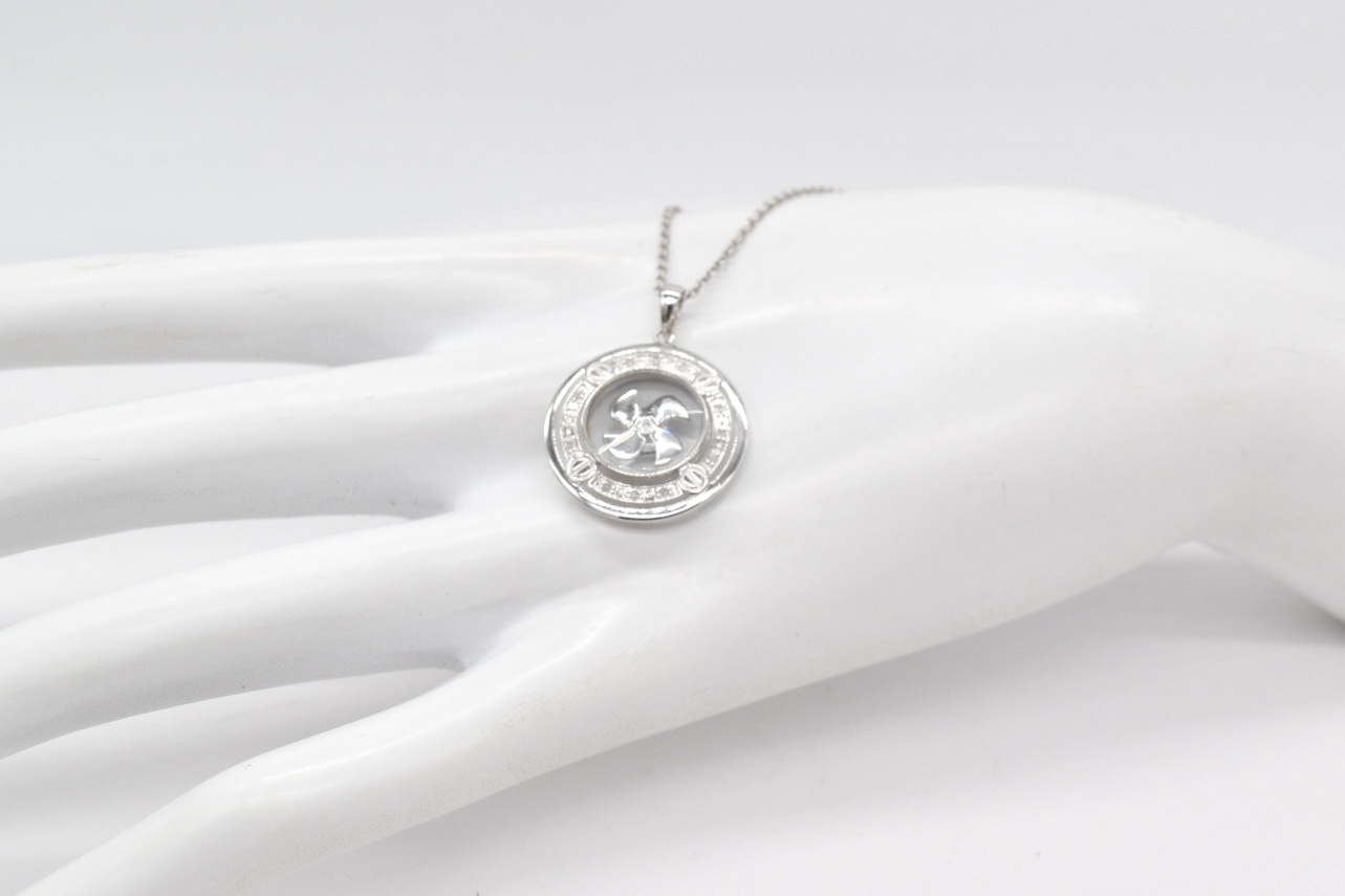 18ct white gold (XRF tested) diamond spinning pendant. Featuring 12 round single cut diamonds, claw set, approximately 0.06ct in total combined weight, P3 in clarity and H in colour.