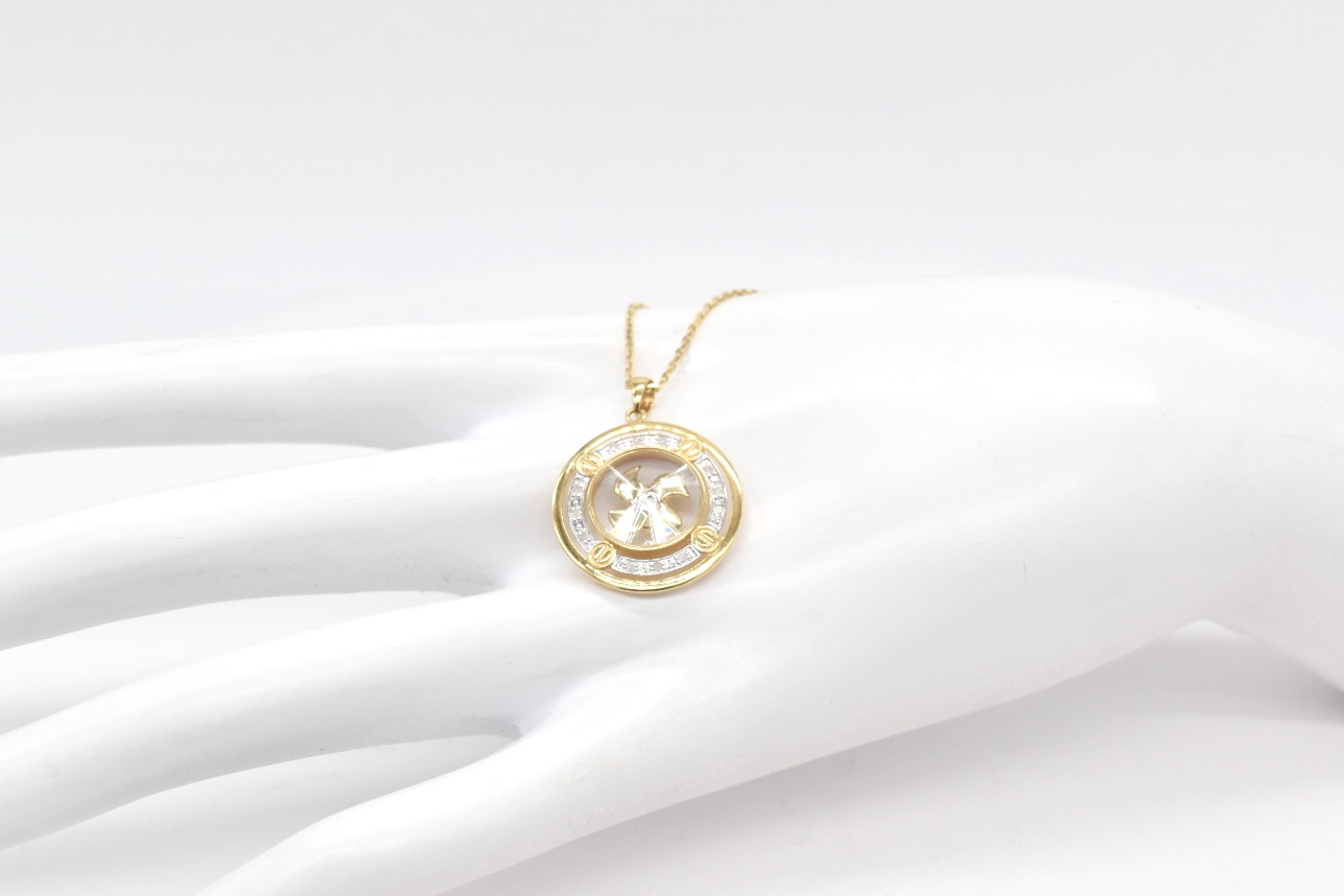 18ct yellow and white gold (XRF tested) diamond spinning pendant. Featuring 12 round single cut diamond, claw set, approximately 0.06ct in total combined weight, P3 in clarity and H in colour.